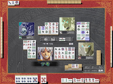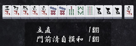 自分の引いてくる牌で4面子1アタマを揃えるアガリ方です。 4人打ちの場合は他の3人全員から点を取ることが出来ます。 ![]() リーチをかけた状態、つまり一度も鳴かずにアガれば さらに役が増え、高得点もねらえますぞ。 ![]() ![]() 門前清自摸和(メンゼンチンツモホー)、通称「ツモ」。 鳴かず(門前)、自分で引いて(自摸)、アガった(和)場合に つく役です。ロンでアガるより、ツモでアガった方が 1翻多く貰える可能性があるのです。自分一人の 力で牌を集めたご褒美ですな。 |