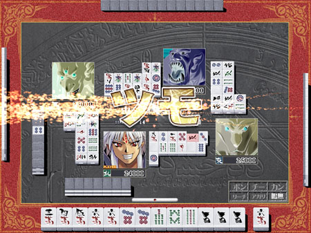 | 「鳴き」同様に、相手の捨て牌を貰ってくる方法です。 これでアガると、そのアガリ牌を捨ててしまった人から点数を取ることが 出来ます(4人打ち)。 ![]() 尚、もし自分がこのときまでに一度でもそのアガリ牌となる牌を 捨ててしまっていては、アガることが出来なくなります。 (ルール設定により変更可能) また、リーチをかけた状態で相手がアガリ牌を捨てたのを見逃して しまっても、同様にその牌でアガることが出来なくなります。 |